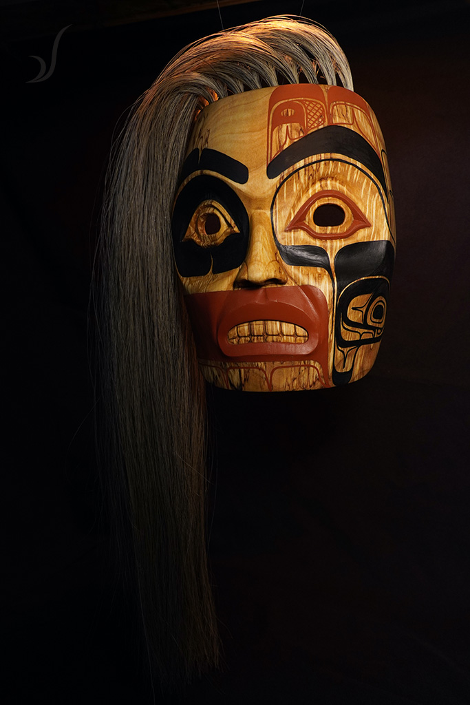 One day Raven (the Trickster figure involved in many of the Creation stories of Northwest Coast mythology) flew up to the Sky World and fell in love with a young, ethereal woman. Raven asked her father if he could marry her. The young woman’s father asked for Raven’s assurance that he would care for the young woman with love and treat her with respect. They marry. One day Raven was impatient as the young woman seemed not to have gathered food, which was among her responsibilities. Instead, she had become focused on teaching herself how to weave. His impatience increased, and this led to an argument. The young woman took her weaving, scooped it down into the river, and pulled out an abundant amount of salmon. Hers is the world’s first woven basket and was the moment when the world’s first salmon emerged in the rivers. Unhappy with Raven’s impatience and how he communicated with her, she walked away from the river and continued beyond and away from Raven forever, flowing back up into the Sky World, drifting back up into the air as fog.