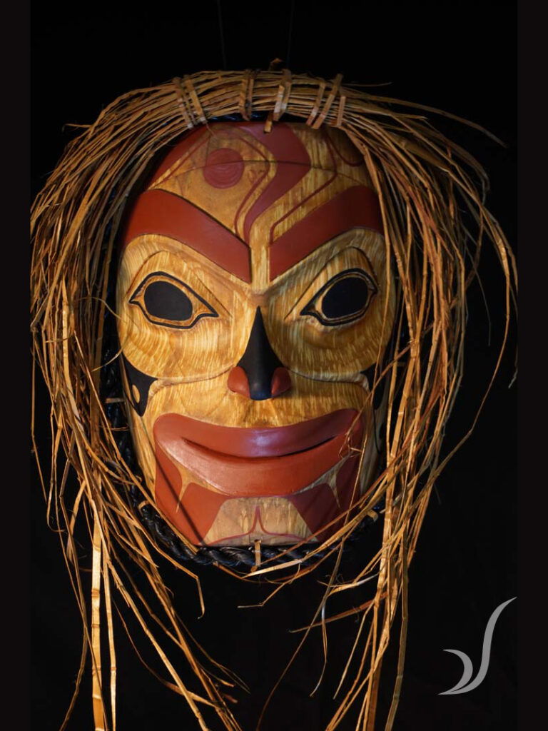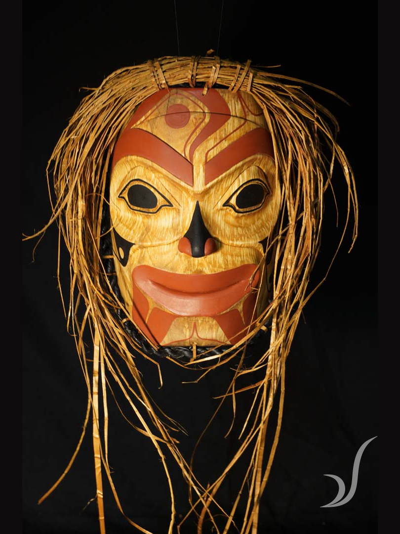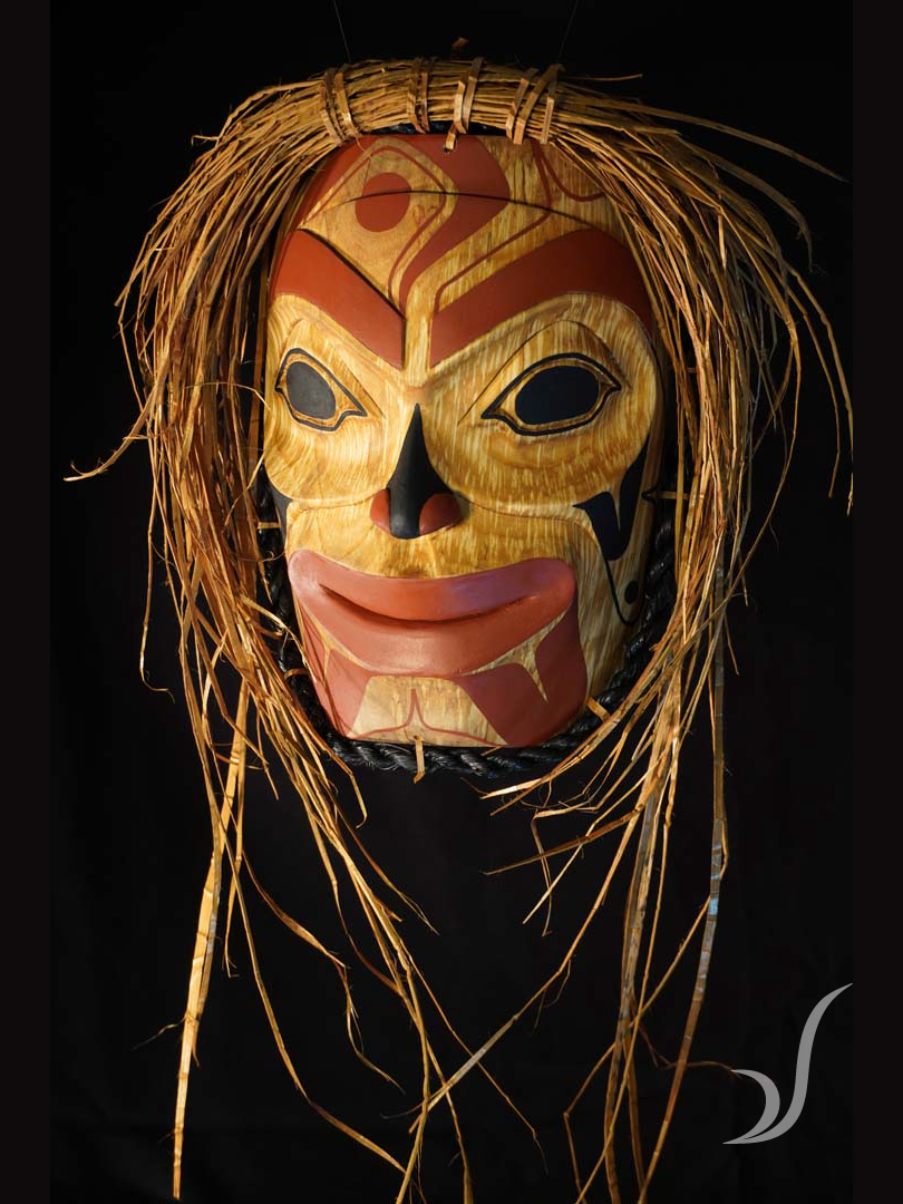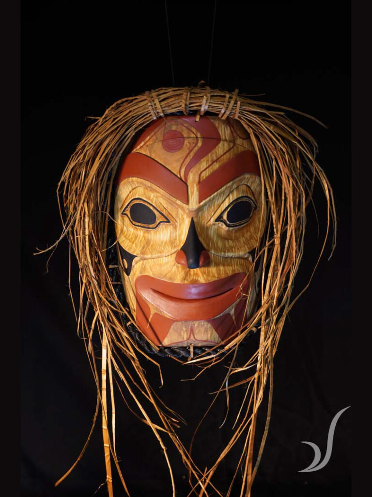 “Inspiration for this mask emerges from my appreciation of native women who I have observed as culture bearers and advocates for our native lands. Their work focuses on protecting our natural resources centered around the forests of Tlingit Aani (Tlingit land – Southeast Alaska)”